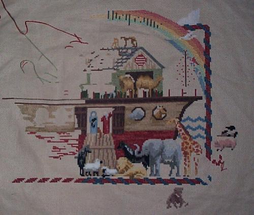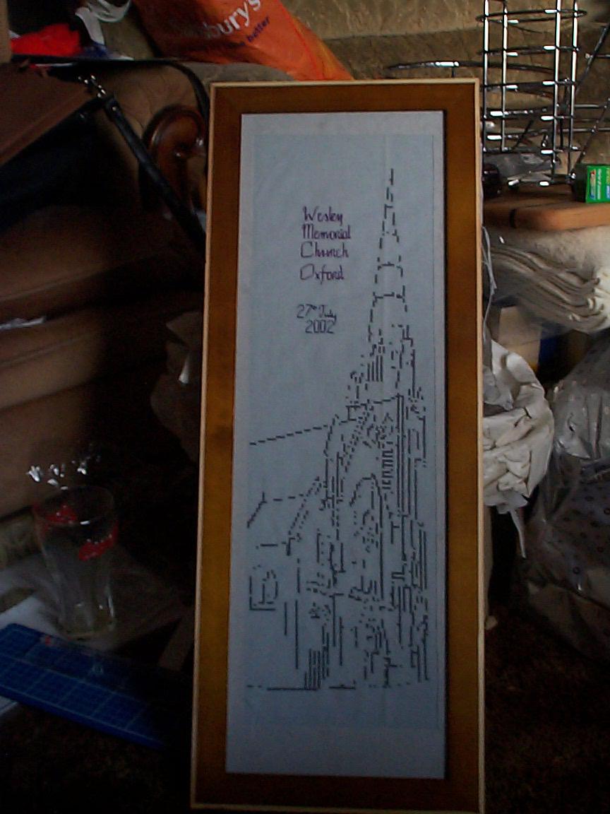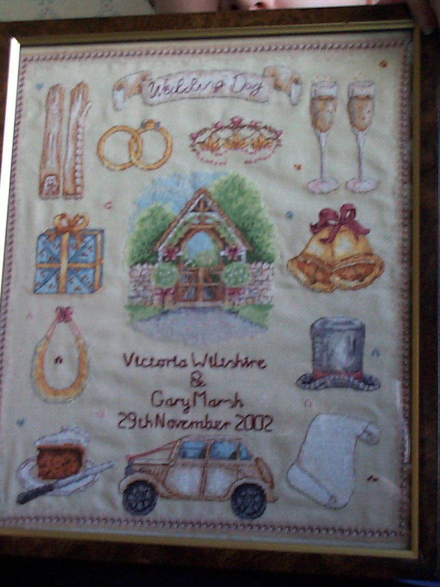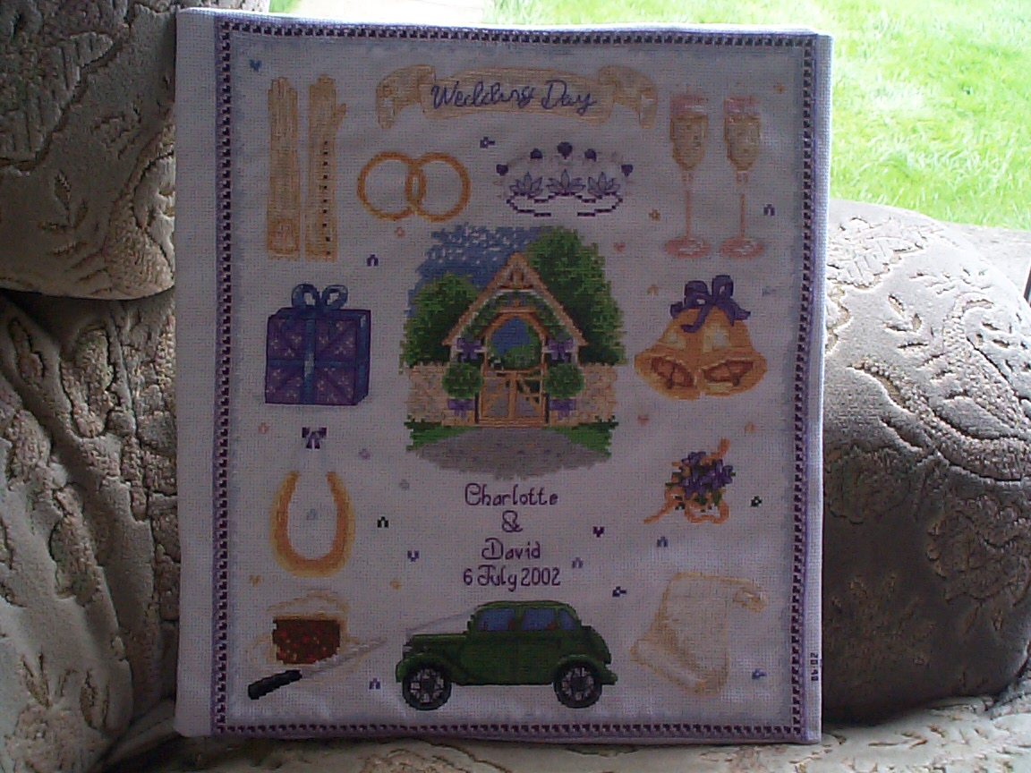 Self-designed wedding sampler (unfinished) for our wedding, July 2002.
